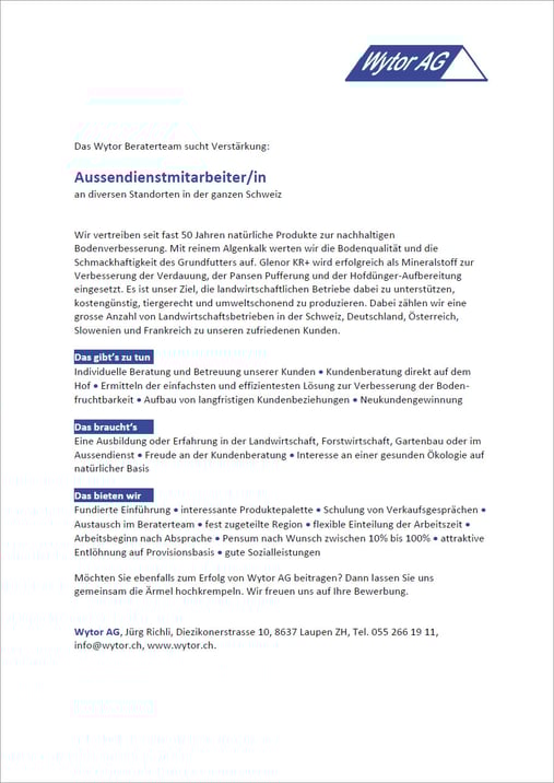 Wytor AG, Jürg Richli, Diezikonerstrasse 10, 8637 Laupen ZH, Tel. 055 266 19 11, info@wytor.ch